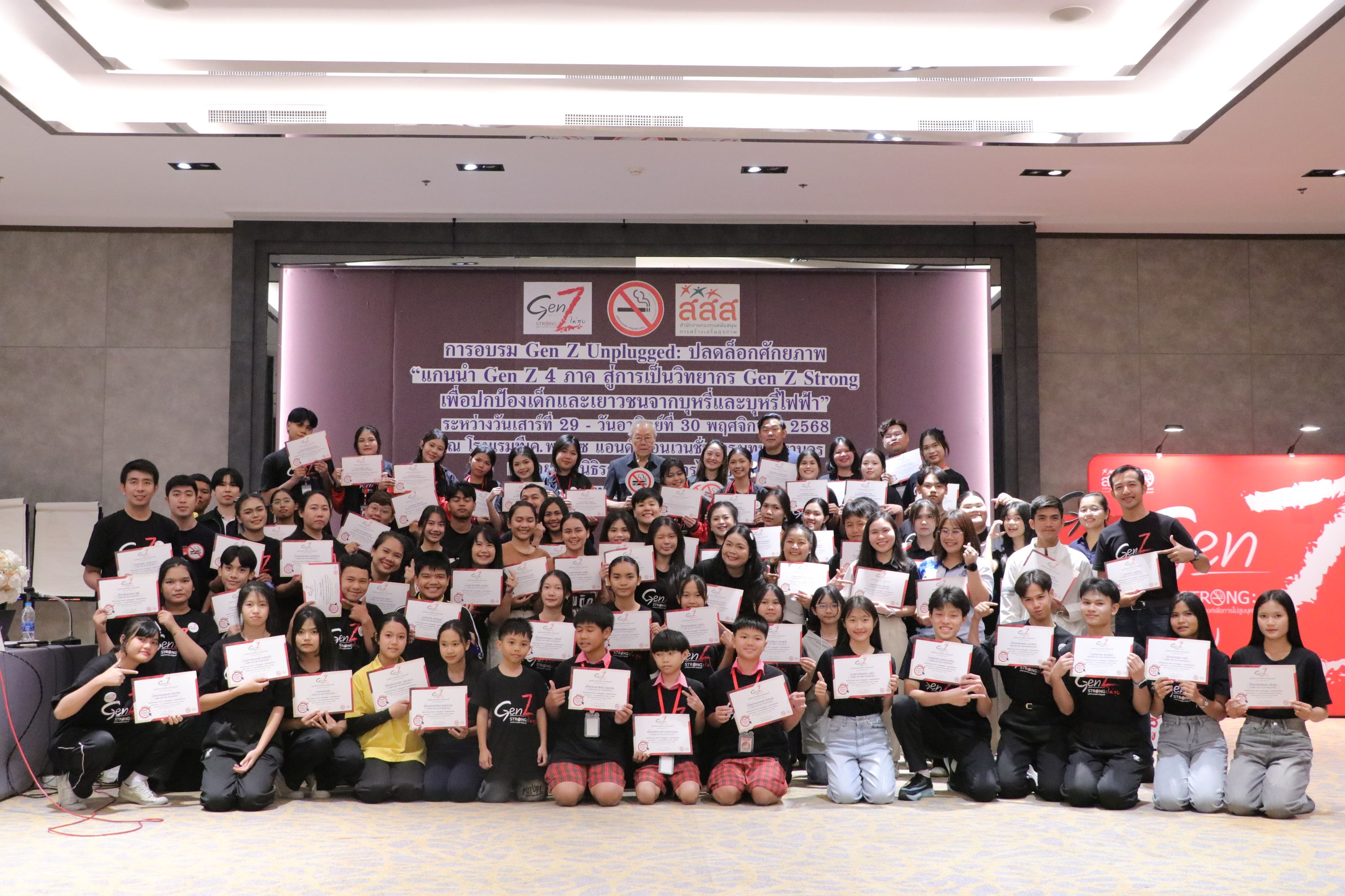 วันนี้ 29 พฤศจิกายน 2568 มูลนิธิรณรงค์เพื่อการไม่สูบบุหรี่ จัดการอบรมเชิงปฎิบัติการอบรม Gen Z Unplugged : ปลดล็อกศักยภาพ “ แกนนำ Gen Z 4 ภาค สู่การเป็นวิทยากร Gen Z Strong เพื่อปกป้องเด็กและเยาวชนจากบุหรี่และบุหรี่ไฟฟ้า” โดย กลุ่มเป้าหมาย เป็น นักเรียนแกนนำ ชมรม Gen Z จาก 4 ภาค จำนวน 56 คน ครูผู้ดูแลที่ปรึกษาชมรม Gen Z จำนวน 25 คน รวม 81 คน จาก 11 จังหวัด ได้แก่ เพชรบูรณ์, เชียงใหม่, แม่ฮ่องสอน, พิษณุโลก, ขอนแก่น, นครราชสีมา, อุบลราชธานี, อำนาจเจริญ, กาญจนบุรี, กทม,กระบี่, โดยมีวัตถุประสงค์ เพื่อ พัฒนาศักยภาพนักเรียนแกนนำชมรม Gen Z 4 ภาค: ให้มีความรู้ความเข้าใจมากขึ้นเกี่ยวกับกฎหมายบุหรี่ไฟฟ้า กลยุทธ์การตลาดและการแทรกแซงของอุตสาหกรรมยาสูบ และอันตรายของบุหรี่/บุหรี่ไฟฟ้า และ ให้นักเรียนแกนนำ Gen Z มีทักษะการพูดเพื่อเตรียมความพร้อมเป็นวิทยากร Gen Z : สามารถถ่ายทอดความรู้เกี่ยวกับกฎหมายบุหรี่ไฟฟ้า กลยุทธ์การตลาดและการแทรกแซงของอุตสาหกรรมยาสูบ และอันตรายของบุหรี่/บุหรี่ไฟฟ้า และสร้างความตระหนักรู้ต่อเพื่อน ๆ ได้อย่างมีประสิทธิภาพ ทั้งนี้ ได้รับเกียรติจาก รศ.ดร.พญ.เริงฤดี ปธานวนิช อาจารย์ภาควิชาเวชศาสตร์ชุมชน คณะแพทยศาสตร์โรงพยาบาลรามาธิบดี ,นายจิระวัฒน์ อยู่สะบาย รองผู้อำนวยการ กองงานคณะกรรมการควบคุมผลิตภัณฑ์ยาสูบ และนายอดิศักดิ์ พุ่มทอง นิติกร กองงานคณะกรรมการควบคุมผลิตภัณฑ์ยาสูบ กรมควบคุมโรค กระทรวงสาธารณสุข การอบรมดังกล่าวจัดขึ้น ระหว่างวันเสาร์ที่ 29 - วันอาทิตย์ที่ 30 พฤศจิกายน 2568 ระหว่าง ณ ห้องแมคโนเลีย2-3 ชั้น 4 อาคาร 3 โรงแรม TK. Palace Hotel & Convention แจ้งวัฒนะ กรุงเทพฯ ซึ่ง สนับสนุนโดย สำนักงานกองทุนสนับสนุนการสร้างเสริมสุขภาพ (สสส.)